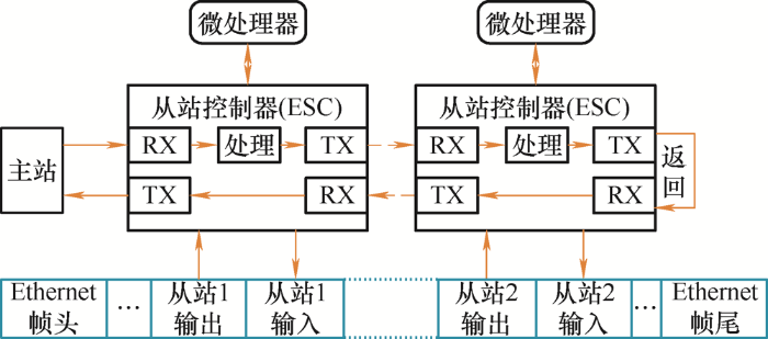 主站发出的控制命令信息集中在一个数据帧内,按照网络拓扑依次达到每一个从站。经过一个从站时,ESC会按照预先确定的寻址方式从数据帧中读取本从站所需的对应数据,并在需要的情况下,将反馈到主站的数据写入数据帧。完成该数据读取过程后,数据帧才会由网络端口转发至下一从站。由于ESC独特的硬件高速处理机制,单个从站的数据帧处理时延仅在微秒级。最后一个从站处理完数据帧后,会将数据帧直接转发回主站。