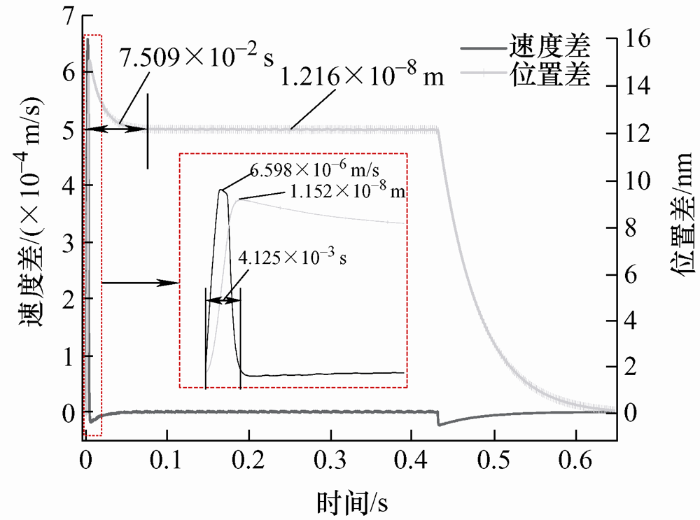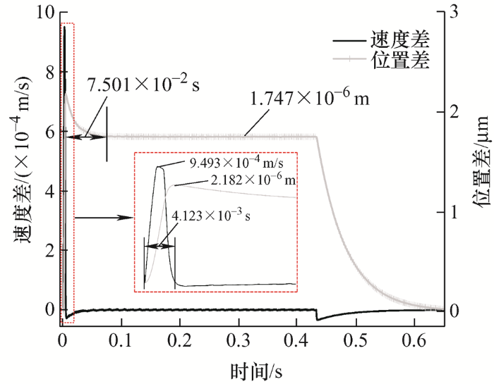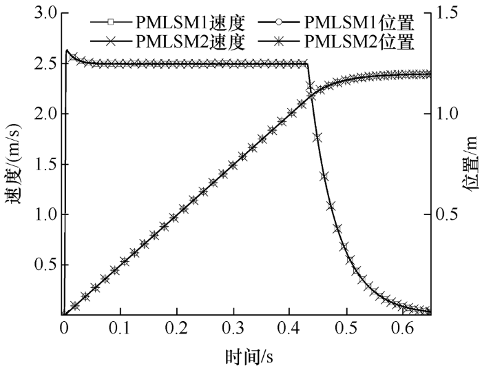 在仿真中,两个分段PMLSM上各有一个次级,控制目标为两个次级以2.5 m/s的目标速度在长度为1.2 m的初级导轨上完成单向全程的匀速直线运动后停止,并据此分析EtherCAT网络下的PMLSM控制性能。图11展示了在SM同步模式下控制两段PMLSM的仿真结果。