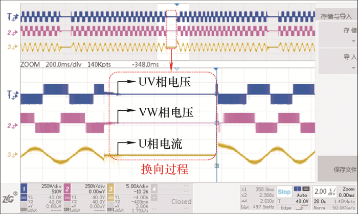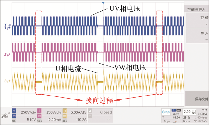 图17是磁浮交通PMLSM驱动样机的次级单向运行工况下的电压电流波形。UV相电压落后VW相电压120°,相电压峰值稳定在220 V左右。此外,电流波形较为规整,波峰值稳定在3 A左右,运行状况良好。次级反向运行工况时与此类似,此时UV相电压超前VW相电压120°。