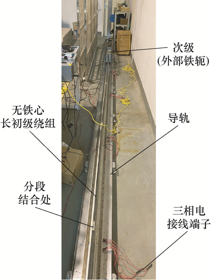 根据上述设计,开发制造出了实际的磁浮交通PMLSM驱动系统样机,如图5所示。样机的初级长度为6 m,由5个分段初级组成,每段长度1.2 m。整体而言,长初级绕组和安装在轨道车辆上的次级按照模块化思想进行设计和制造,有利于缩短制造周期及降低制造成本,在后期研究中可根据需要延长样机长度。此外样机的绕组分布简单,端部接线容易。位置传感器采用沿导轨分布的增量式磁栅尺。