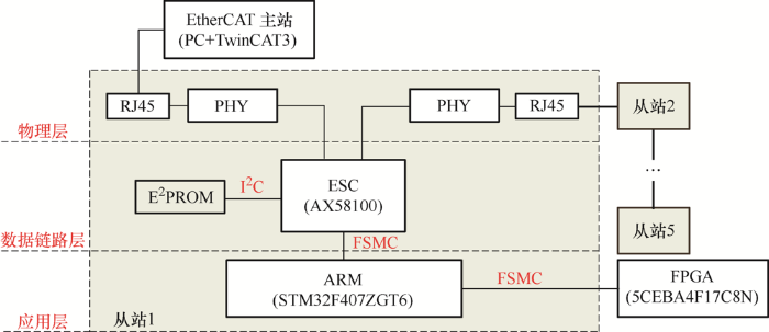 EtherCAT主站选用了Beckhoff TwinCAT3软件,可支持封装外部C/C++和Matlab/Simulink等高级语言的功能模块,十分灵活;EtherCAT从站方面则选用了AX58100型号的从站控制器(EtherCAT slave controller, ESC)芯片。由于磁浮交通PMLSM驱动系统样机的长初级分为5段,每一段子初级都作为一个独立的被控对象,因此网络中对应有5个从站。相邻的从站之间通过双绞线电缆相互连接,并接入主站。