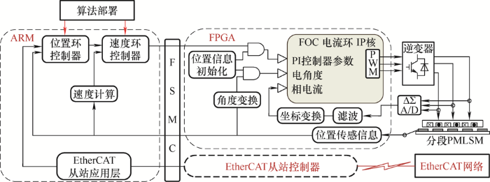 EtherCAT是目前应用最为广泛的工业以太网技术之一[13],主要用于在样机系统中实现控制器之间的通信组网功能。另外,算法部署和PMLSM驱动控制部分则分别选用了基于ARM主控和基于FPGA主控的芯片。ARM具有高性能的硬件资源和多任务实时处理的能力,而FPGA则在大规模并行处理方面具有优势,常作为协处理器使用[14]。换言之,这种双核架构的设计改进了以往将算法部署和控制实现集中在单一主控芯片上的方式,从而实现功能分离,既方便调试,也有助于提高控制器的性能。具体而言,因为ARM开发难度低,即使是十分复杂的算法也可以通过常规的高级语言来编写部署,同时算法中的关键参数被传输到FPGA中进行必要的计算加速,并执行PMLSM的驱动控制程序。另外,出于闭环控制和算法中参数动态调整的需要,数据还可以从FPGA回传至ARM。图6显示了控制器的设计概览。