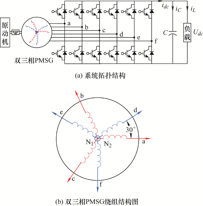 图1 为双三相PMSG整流系统的拓扑结构,电机两套绕组中性点隔离,相位上互差30°。图1 中,发电机将原动机的机械能转换为交流电输送给整流器,整流器将交流信号转换为稳定直流电压供负载使用。