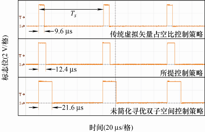 图12 给出了两种控制策略的算法执行时间对比,并同时给出了未简化寻优双子空间控制策略的算法执行时间。本文所提控制策略增加了x-y 子空间控制集,因此,当没有采用简化寻优策略时,寻优过程中的计算量相当于增加了一倍,如图12 所示,算法需要21.6 μs完成两个子空间最优电压矢量的选取和占空比计算的工作。当采用简化寻优策略时,算法部分只需要12.4 μs即可完成寻优工作。与传统虚拟矢量占空比MPCC策略相比,本文所提控制策略在算法计算时间上虽然稍有增加,但实现了更好的谐波电流抑制效果。