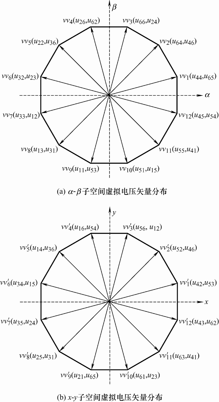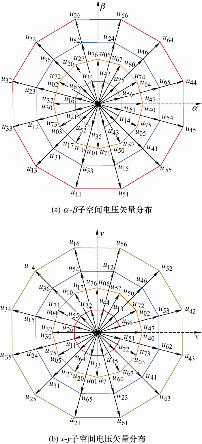 (1) α-β 子空间中最外层和最内层的电压矢量分别映射为x-y 子空间中最内层和最外层的电压矢量;x-y 子空间中最外层和最内层的电压矢量分别映射为α-β 子空间中最内层和最外层的电压矢量;位于中间两层的电压矢量在两个子空间中具有相同的幅值。