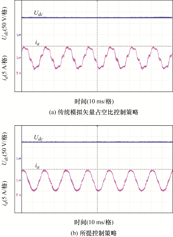 图9 给出了负载电阻为20 Ω情况下两种算法的稳态试验波形。由图9 可知,两种控制策略的直流母线电压均可以准确跟踪给定值。但是,传统虚拟矢量占空比MPCC算法定子电流畸变严重,而本文所提控制算法的定子电流正弦度明显得到提升。试验结果与仿真一致。