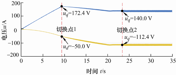 当电机在转速ωB 2 时切换,由于ωB 2 =ωB 2 ' ,电机的工作点将由B 2 点突变至B 2 ' 点,dq 轴电流突变,产生较大的转矩脉动,进而可能引起失控。若电机在B 2 点没有切换,继续沿着电流极限圆进行恒功率弱磁,然后切换,则dq 轴电流突变加剧,产生更大的转矩脉动,这将增加电机失控的风险。一旦电机运行到D 点不切换,注意到D 点是电流极限圆与电压极限圆的唯一交点,由于转速波动,则电机转速可能为ωe =ωH ,而此时电流指令因为电压饱和而被钳位在D 点。