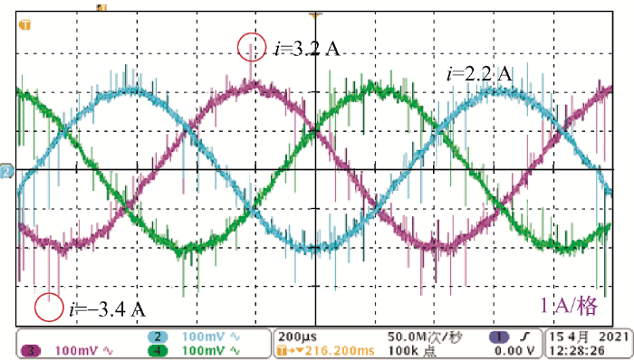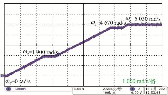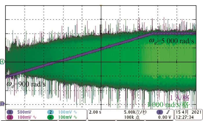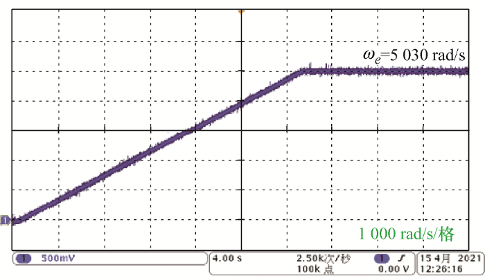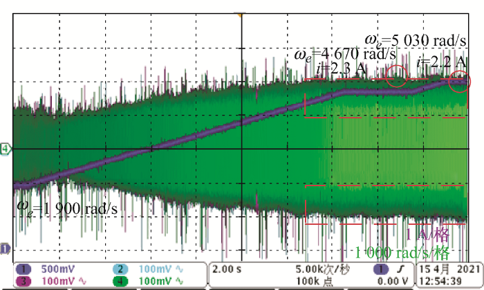 根据图12 、图13 可知,采用超前角结合MTPV控制策略,加速及稳态过程中转速较稳定,转速、电流的变化趋势与仿真相符,弱磁性能较好。稳定时转速ωe =5 030 rad/s,对应机械转速nr = 12 009.13 r/min,转速误差率0.6%,相较于切换前略有所增大。