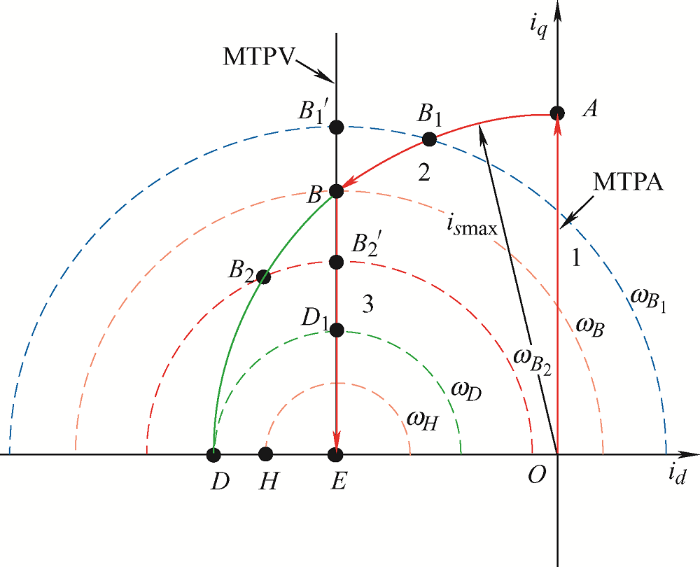 如图2 所示,电流、电压极限圆与MTPA、MTPV曲线分别交于A 点、B 点;D 点坐标为(is max , 0),点B 1 、B 1 ' ,点B 2 、B 2 ' 和点D 、D 1 分别为转速ωB 1 、ωB 2 、ωD 对应的电压极限圆与电流极限圆、MTPV曲线的交点,则有ωB 1 =ωB 1 ' ,ωB 2 =ωB 2 ' ,ωD =ωD 1 。虚线表示一簇电压极限圆,随着转速升高,电压极限圆逐渐向E 点收缩,E 点坐标为(-ψf /Ls , 0),且有ωB 1 <ωB <ωB 2 <ωD <ωH 。