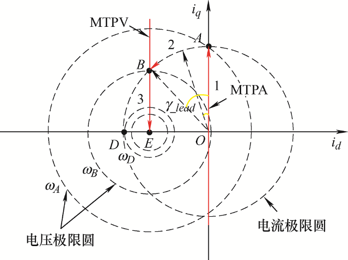 其中,T 1 、T 2 为恒转矩曲线,MTPA、MTPV曲线分别与电流、电压极限圆交于A 点、B 点;电压极限圆与电流极限圆相切时的切点为D 点;电压极限圆圆心为E 点,E 点处的d 轴电流即为特征电流。A 、B 、D 点对应转速分别为ωA 、ωB 、ωD 。