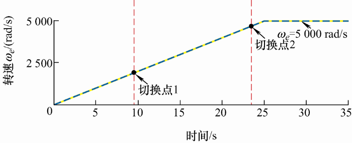为使SPMSM进入深度弱磁区,给定参考转速ωe =5 000 rad/s,对应机械转速nr =11 937.5 r/min,仿真转速波形如图5 所示,其中,切换点1、2分别对应转速ωA 、ωB 。