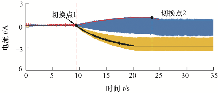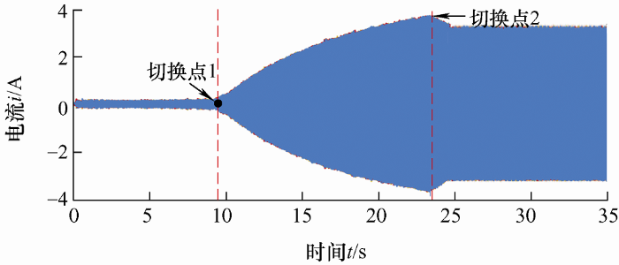 由图14 不难看出,电流纹波较大,如图中圆圈所示,最高约3.4 A,这将对SPMSM的弱磁性能造成一定影响,随着转速升高,电流纹波将会越来越大,当转速到达恒功率弱磁区到深度弱磁区过渡点对应转速,即仿真中切换点2对应转速,若转速进一步升高,而不切换控制策略,则容易引起电机失稳。