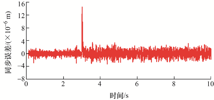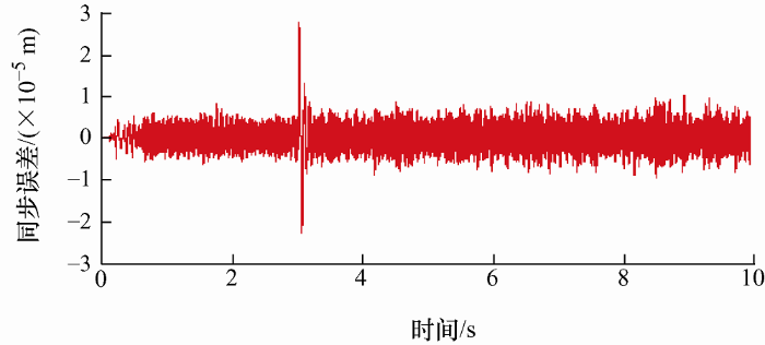 图6 和图9 分别是在两种控制策略下得到的跟踪误差图,当系统趋于稳定后,第一种控制策略将跟踪误差限定在-6×10-4 ~6×10-4 m,第二种控制策略将跟踪误差限定在-3.2×10-4 ~3.2×10-4 m,可以明显看出,第二种控制策略跟踪精度更高。图7 和图10 是在两种控制策略下的同步误差图,由于在3 s时施加了32 N的负载扰动,两种控制策略在3 s时同步误差都有明显的增大,第一种控制策略下的最大同步误差达到28 μm,当系统稳定后,同步误差限定在-10~10 μm。在相同的试验条件下,第二种控制策略的最大误差达到14.5 μm,当系统稳定后,同步误差限定在-3.5~3.5 μm,显而易见,第二种控制策略的同步误差更小,抗扰性更强。