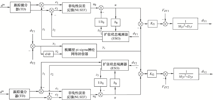 (12) $\left\{ \begin{align} & {{e}_{1}}\left( k \right)={{x}_{1}}\left( k \right)-{{z}_{1}}\left( k \right) \\ & {{e}_{2}}\left( k \right)={{x}_{2}}\left( k \right)-{{z}_{2}}\left( k \right) \\ & {{u}_{0}}={{k}_{1}}fal\left( {{e}_{1}},{{\alpha }_{3}},\delta \right)+{{k}_{2}}\left( {{e}_{2}},{{\alpha }_{4}},\delta \right) \\ \end{align} \right.$