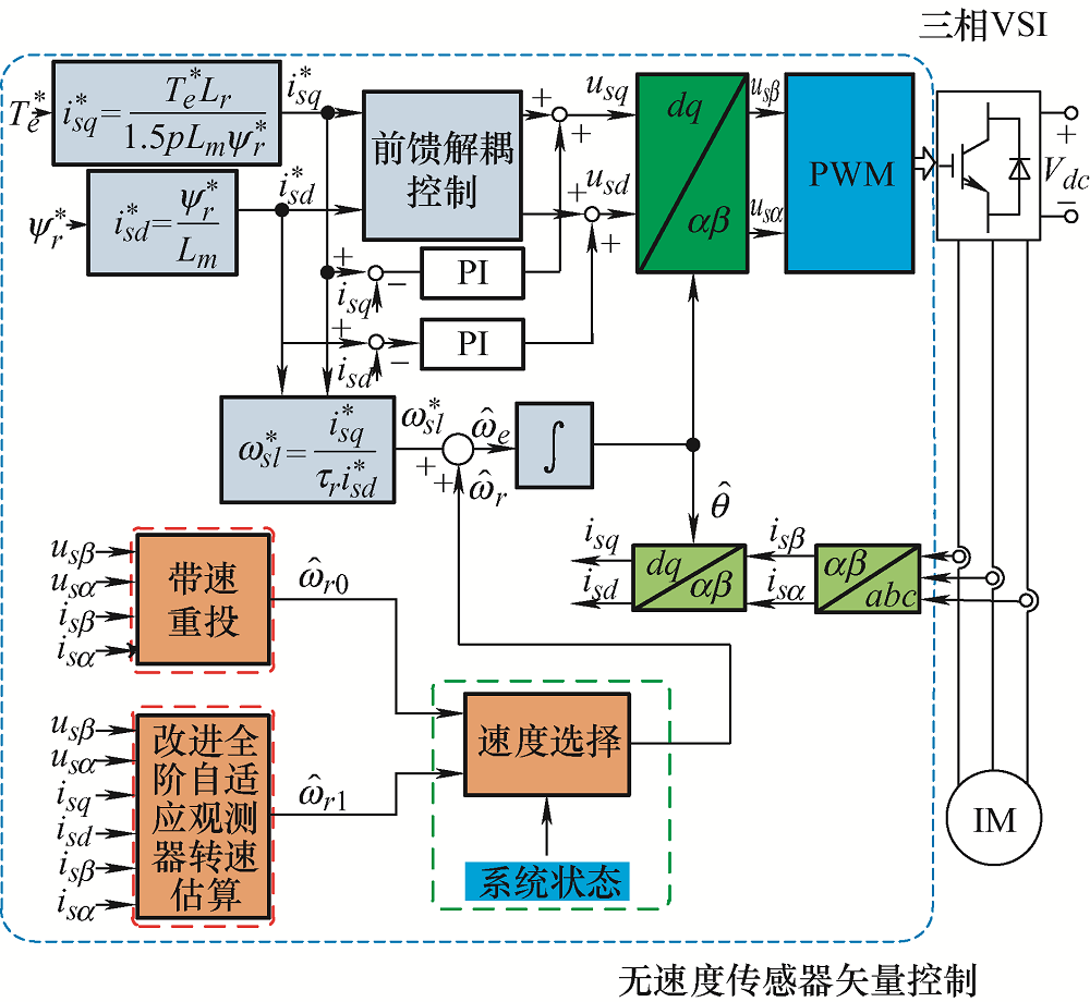 基于三阶段的感应电机无速度传感器矢量控制框图