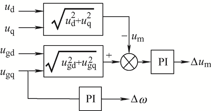 图1 中,u gd 、u gq 分别为船网电压以岸电电源输出端电压相位为参考相位进行坐标变化得到的dq 轴分量;u d 、u q 分别为岸电电源输出电压的dq 轴分量;Δu m 、Δω 分别为电压幅值补偿量和角频率补偿量。由预同步单元得到的Δu m 、Δω 分别送入VSG的励磁单元和功频调节单元,最终通过闭环控制实现了岸电电源与船舶电网间电压幅值、相位的同步。