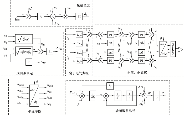 基于VSG的岸电电源控制主要由功频调节单元、励磁单元、定子电压方程,预同步单元等部分组成。