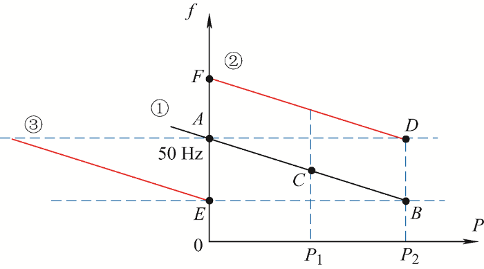 值得注意的是:船侧发电机在接入岸电的过程中调速特性只进行一次调节[14 ] ,即发电机输出特性始终为曲线①,且初始带载运行的频率略低于50 Hz;若岸电电源在并网后立即阶跃功率给定,则其初始空载频率为F 点频率,相比于文章提出的二段式负载转移策略,增加了频率的波动范围。