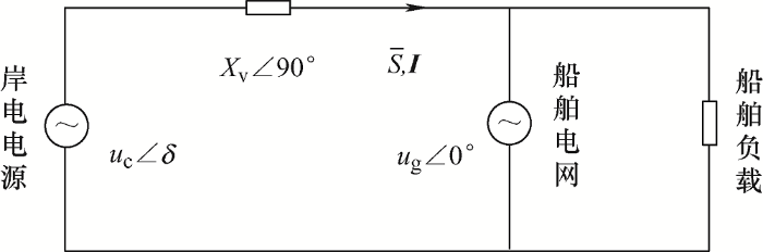 图5 中,u c $\angle$δ 、u g $\angle$0°分别为岸电电源电压和船舶电网电压;X v $\angle$90°为虚拟电抗;$\bar{S}$,I 分别为岸电电源输出的复功率和电流。由电路基本原理可得
