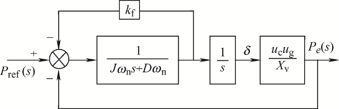 (1) $\left\{ \begin{align} & \frac{{{P}_{\text{m}}}}{{{\omega }_{\text{n}}}}-\frac{{{P}_{\text{e}}}}{{{\omega }_{\text{n}}}}=J\frac{\text{d}(\omega -{{\omega }_{\text{n}}})}{dt}+D(\omega -{{\omega }_{\text{n}}}) \\ & {{P}_{\text{m}}}={{P}_{\text{ref}}}+{{k}_{\text{f}}}({{\omega }_{\text{n}}}-\omega ) \\ & \frac{\text{d}\delta }{\text{d}t}=\omega -{{\omega }_{\text{n}}} \\ \end{align} \right.$