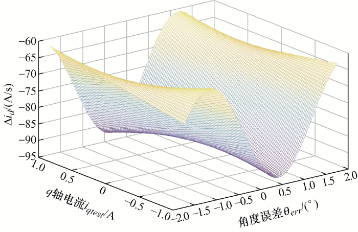 式(10)展示了估计轴系的d 轴电流导数与角度误差的关系,但关系受工况(d 、q 轴电流以及转速)的影响。图7 展示了在静止状态下,d 轴电流为0 A时,估计d 轴电流导数与q 轴电流,角度误差的关系。