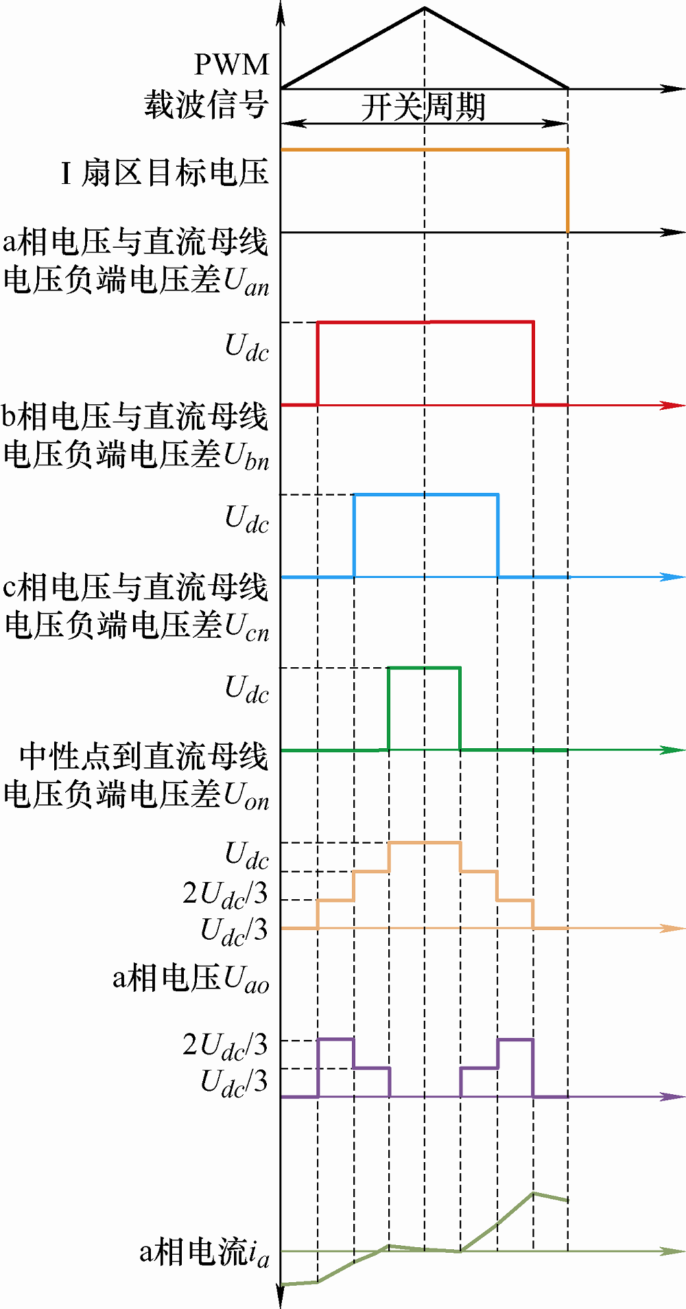 I扇区的逆变器电压、a相电压和电流