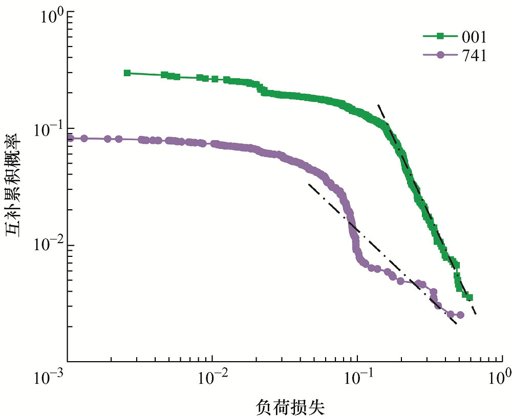 1号信息网络拓扑与741号信息网络拓扑负荷损失互补累积概率分布图