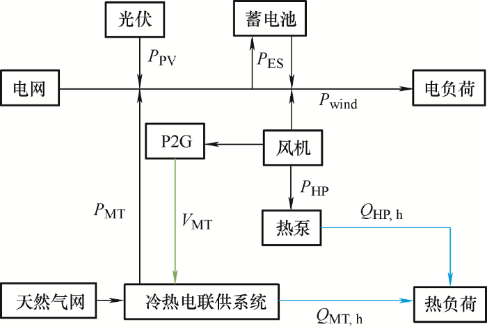 由于人类社会越来越多元化的需求,未来的电力系统不会再独立运行,必然是结合天然气、光伏、风电等多种能源形式的综合能源系统[1 ⇓ -3 ] 。在以冷热电联供(Combined cooling, heating and power, CCHP)系统为核心的综合能源系统中,“以热定电”或“以电定热”模式均有其劣势,不利于能源系统的灵活调配。而地源热泵技术可以解除热电耦合,不再受到“以热定电”的限制,使CCHP灵活调控。热泵可以消耗少量电能,并输出大量热能,其值为所消耗电能的3~8倍,能源的利用效率极高。由于风电出力的波动性及间歇性,导致风电难以大规模上网接入使用,而电转气(Power to gas, P2G)装置的出现使得风电的大规模利用和存储成为可能。电转气装置可以将多余的风电转换成氢气或天然气,但由于氢气不利于大规模存储及运输,且其安全系数不如天然气,因此一般转换成天然气运输或存储。此类能源转换设备可以提高系统灵活性,也可以将天然气系统、热(冷)系统、电力系统进行耦合,增强系统间的联系。文献[4 -5 ]构造含电转气的热电联产模型,验证了电转气设备能够提高能源多级利用率,增强系统电/热储能配置优化但并未考虑电转气设备对于消纳风电的作用。