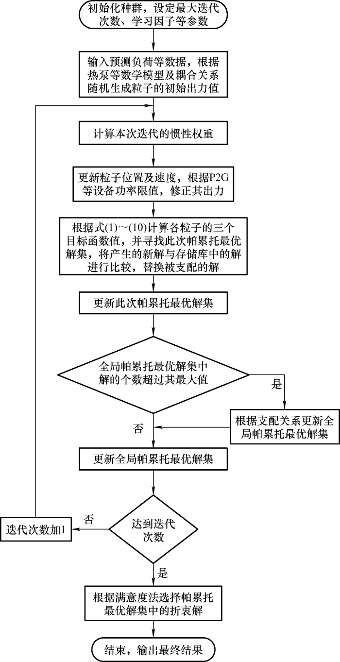 由于本文所研究的为多目标优化问题,使用传统的线性加权法难以得到合适的全局折衷解,因此本文选用帕累托多目标粒子群算法[17 ] 求解。通过判断解向量之间的支配关系,得到非劣解集,再计算非劣解集中的满意度,选取其最大值作为最终解。
