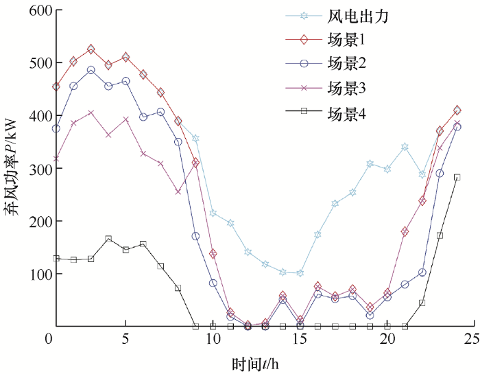 由表1 可以看出,在系统内不含热泵及P2G装置时,系统内的综合成本、气体排放量以及弃风率都是最高,其中弃风率达到了75.94%,大量的风电被浪费;而加入热泵时,其综合成本相较于场景1减少了约17.33%,弃风率减少了12.88%。而由于热泵的加入,使得燃气轮机不用承担全部的热负荷,因此会使燃气轮机需要的天然气的量减少,从而使得气体排放量减少,降低了约12.69%;场景3加入P2G装置时,由于P2G装置可以供给燃气轮机所需的一部分天然气,所以除了减少的一部分弃风惩罚费用外,还会在燃气轮机的燃气费上减少一些,因此在综合成本上比场景2略低,相较于场景1减少了约28.38%,而风电消纳率提高了13.64%。可以看到在系统内单独加入热泵或者P2G时对于系统内消纳风电的情况是有效的,并且由于P2G装置可以消耗多余的风电产生天然气供给燃气轮机使用,能减少一部分的综合费用,在经济成本方面效果更好;当同时加入热泵和P2G装置时,系统的综合成本大大降低,减少了约45.03%,同时弃风率仅有35.62%,极大提升了系统消纳风电的能力。