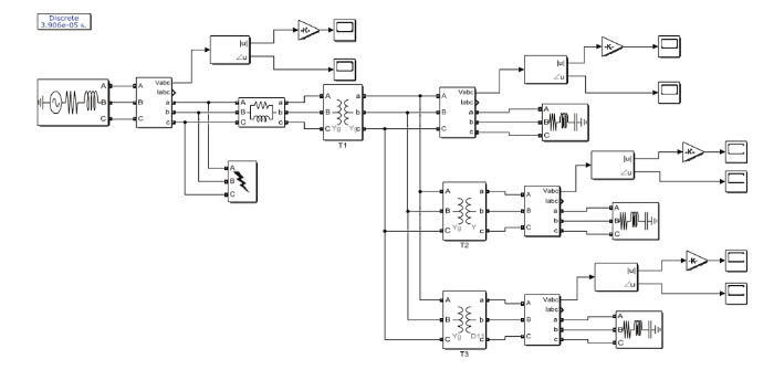 为了验证所提电压暂降类型识别算法的正确性,利用Matlab进行了仿真分析,图5为搭建的短路故障仿真模型,中性点有效接地系统,1型变压器T1变比为110 kV/10.5 kV,2型变压器T2、3型变压器T3变比为10 kV/0.4 kV。采样频率设定为25.6 kHz,采样点为每周波512点,基频频率取工频50 Hz,对原副边电压进行FFT分析得到三相电压的幅值和相位。