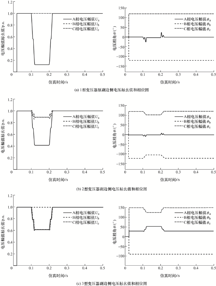 设置A相接地故障,此时为B型暂降,即一相电压幅值降低且可能发生相位跳变,另外两相电压幅值和相位保持不变;B型暂降经过1型变压器T1后原副边电压标幺值和相位图见图6a,暂降类型不变;B型暂降经过2型变压器T2后副边电压标幺值和相位图见图6b,变压器副边电压暂降类型变为D型,即三相电压方均根值减小且三相相位都可能发生跳变;B型暂降经过3型变压器后副边电压标幺值和相位图见图6c,由文献[4]中3型变压器的传递矩阵可得,经3型变压器后电压相位移+30°。变压器副边暂降类型变为C型,即一相电压保持不变,另外两相电压方均根值减小且相位跳变方向相反。仿真结果表明B型电压暂降经变压器的传播规律与表1分析的结论一致。其他类型的仿真结果不再一一列出。