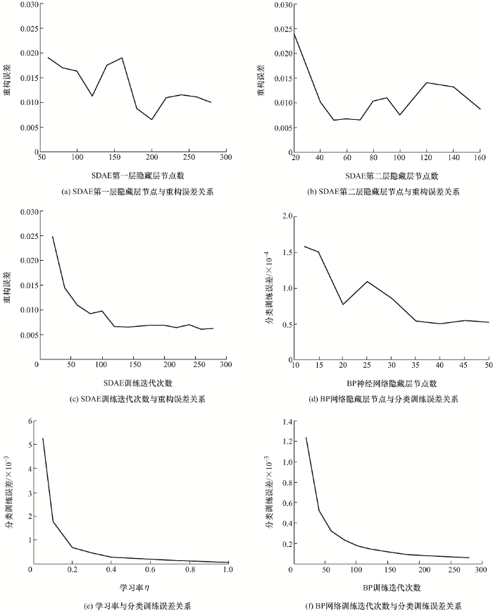 本文SDAE-BP模型包括1个输入层,2个隐藏层和1个一层的BP神经网络。该SDAE模型具有2个DAE网络,每个DAE网络和BP神经网络均使用Sigmoid函数作为激活函数。SDAE-BP网络的训练迭代曲线见图7,根据训练结果,各层节点数分别选取384、200、50、40、7;SDAE和BP训练迭代次数分别为120和200,学习率为1,动量参数为0.5,数据批次大小为100。