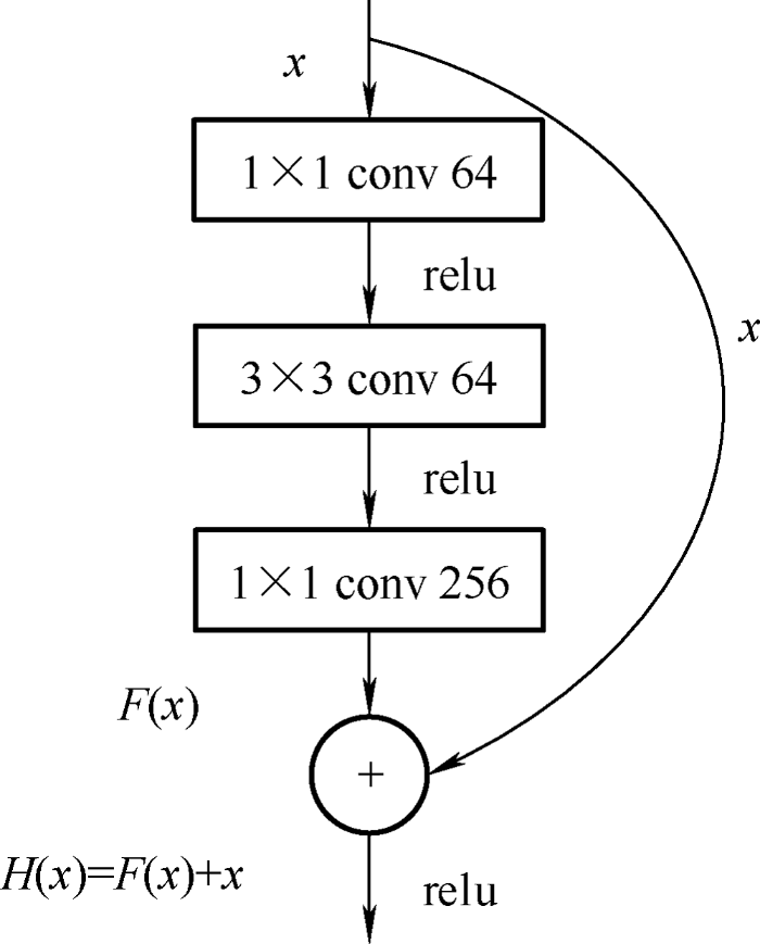 残差网络是由来自Microsoft Research的4位学者提出的卷积神经网络,在2015年的ImageNet大规模视觉识别竞赛中获得了图像分类和物体识别的优胜。其内部残差块的结构如图1所示,包含三个卷积层,卷积层间使用relu激活函数,F(x)表示经过两层权重映射后的结果,残差块的输出结果为H(x)=F(x)+x。残差网络使用跳跃连接,打破了传统的卷积神经网络n-1层的输出只能给n层作为输入的惯例,使某一层的输出可以直接跨过几层作为后面某一层的输入,从而在不过度拟合的情况下拓展网络深度,一定程度上保护了信息完整性,同时简化了学习的难度,有效地减少了参数量和计算量。