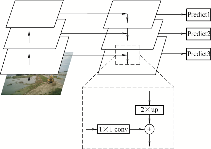 YOLOv3目标检测网络以Darknet-53特征提取网络作为基础网络,实现了端对端的训练,将目标检测由分类问题转换为回归问题,直接预测不同目标的类别和位置,相比需要先产生候选区域的检测算法具有明显的速度优势。而且YOLOv3借鉴了特征金字塔(Feature pyramid networks, FPN)网络中的思想,在3种尺度下进行特征图融合与预测,提高了算法对不同大小目标的检测能力;将其应用于输电线路通道隐患目标检测,有效解决了因监视点距离隐患目标较远造成的目标过小从而引起的漏检问题。特征金字塔结构如图2所示。