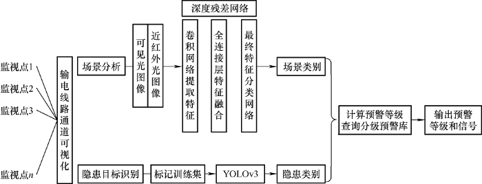 近年来,随着计算机视觉技术[1]的发展,输电线路通道可视化得以实现。通过输电线路通道的可视化管理代替传统的人工定期巡线,有效解决了偏远地区人工巡线困难,隐患高发段高密度巡线要求,以及隐患发现不及时和输电线路“三跨”在线监测等问题[1⇓-3]。但随着输电线路通道可视化工程的扩建、监视点的增多以及隐患类别的增加,每日采集的数据量和识别出的隐患目标量庞大,这无疑在增加在线监视人员工作量的同时,也不利于输电线路运行维护人员的工作开展。因此,深入研究输电线路通道的各类隐患对输电线路安全稳定运行的影响,以及建立并完善输电线路通道可视化的分级预警模型显得至关重要。已有相关学者在输电通道可视化方面做了不少研究,文献[4]基于泛在电力物联网架构,提出一种基于深度强化学习与图像智能识别的输电线路在线监测系统,实现了对烟雾、树障、异物、覆冰等干扰因素的监控;文献[5]提出一种基于Skyline的输电线路巡检数据三维可视化方法,解决了数据统一化管理问题;文献[6]针对不同应用场景需求,设计了不同的无线通信方案,为可视化监控终端提供了更多的选择;文献[7]通过引入虚拟现实技术,为新兴技术在虚拟与现实一体化提供了参考;文献[8]采用人工智能图像识别技术实现了对工程车辆、山火隐患、导线异物、线路故障的自动识别与预警。