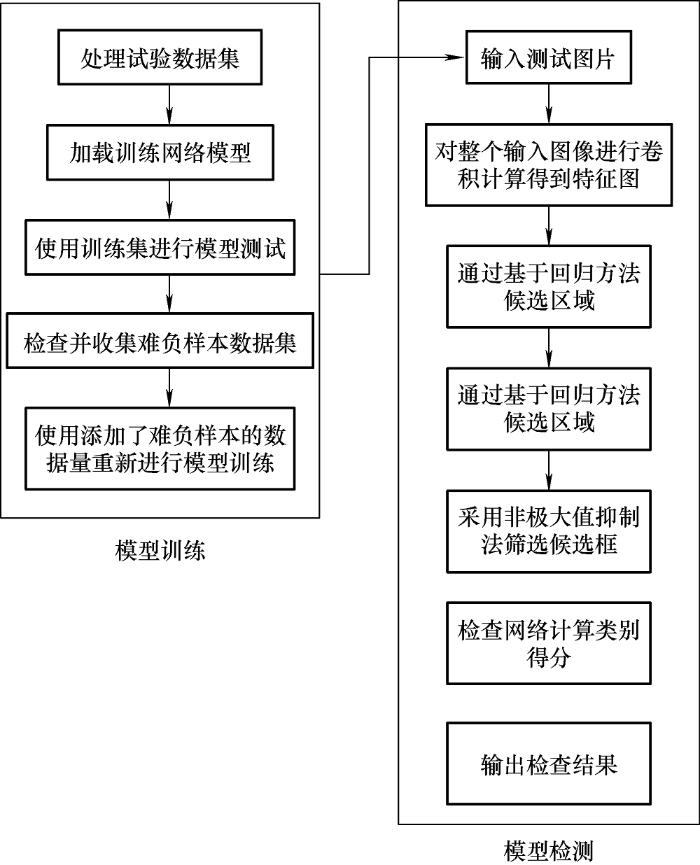 本文提出在训练过程中加入难负样本挖掘策略,图4为训练方法改进后的流程图。首先训练数据集,得到负样本,将置信度大于0.8但与目标真实框的交并比值小于0.5的矩形框输出定义为难负样本;然后将收集到的难负样本加入训练集,重新对网络进行训练,提高网络的检测精度。由于该策略仅在训练时使用,在训练完成检测时与原来一样,因此不会对网络的运算量造成负担。