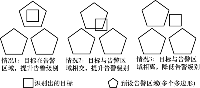 通过分析可以得出工程器械停留时间与告警级别正相关,停留时间越长,危险系数越高。工程器械的运动速度与告警级别负相关,速度越快,在告警区域停留时间越短。工程器械告警框到预设框的距离与速度成负相关,速度越快,距离越短。预警框与隐患的相对位置是首要影响因素,与告警优先级正相关,不同种类工程影响也各不相同,有高危、常规工程机械。上述式子可以简化为