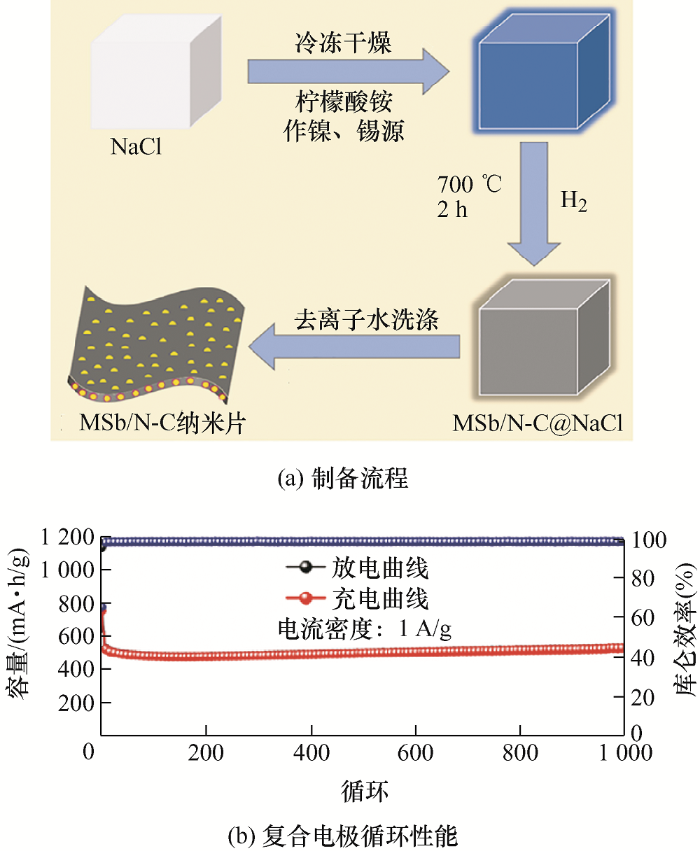 PAN等[40]以NaCl作模板,用柠檬酸铵作碳源和氮源,通过冷冻干燥方法制备了N掺杂碳纳米片封装SnSb纳米颗粒的复合结构(图10a),片状的氮掺杂碳纳米片结构能够提高电导率,缩短离子和电子的传输距离,并避免SnSb纳米颗粒的团聚生长,用作锂离子电池负极材料时表现出优异的循环和倍率性能。在1 A/g的电流密度下,循环1 000次仍能达到537.5 mA·h/g的高容量 (图10b)。JENA等[38]通过一种廉价且工业可推广的微波辅助水热法制备了N掺杂Sn-SnSb/rGO的三明治结构,SnSb纳米颗粒固定并分散在石墨烯片之间,缓解电极的体积变化及合金颗粒的团聚生长。此外,掺杂N原子的石墨烯片引入了机械缺陷,降低扩散势垒,一定程度上提高了锂的可逆存储。将其作为锂离子电池负极材料时,也表现出优异的循环和倍率性能。