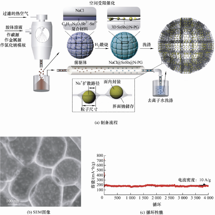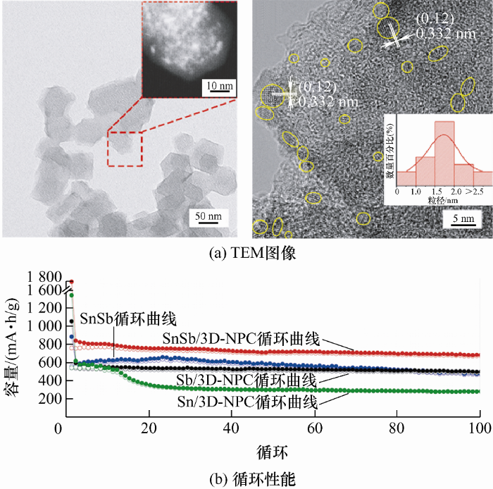 QIN等[24,58]以NaCl为模板,利用喷雾干燥方法原位制备三维N掺杂多孔石墨烯骨架面内约束SnSb纳米颗粒(3D-SnSb@N-PG)的复合结构(图11a, 图11b)。一方面,复合结构中SnSb合金颗粒的超小粒径和均匀分布能够提高活性材料在电化学反应中的利用率,使得电极材料具有较高的倍率性能;另一方面,该结构中的少层石墨烯对SnSb纳米颗粒的包覆,极大地提高了活性材料的电子电导率和结构稳定性。作为钠离子电池的负极材料,在10 A/g的大电流密度下,经过4 000次循环容量依然高达190 mA·h/g,容量保持率接近100%(图11c)。WANG等[59]报道了三维类石墨烯多孔碳网络包覆SnSb@SnOx/SbOx@C纳米颗粒的复合结构(图12a),该结构中连续的类石墨烯多孔碳网络能提供大量的离子通道,合金颗粒最外层的石墨层阻止SnSb纳米颗粒的团聚和生长,并提高了电子导电率,中间的非晶SnOx/SbOx层有效增强了SnSb合金和碳基体之间的界面相互作用。作为锂离子电池负极材料,表现出了优异的循环性能,在1 A/g的电流密度下,经过200次循环其可逆放电容量依然达到600 mA·h/g(图12b)。