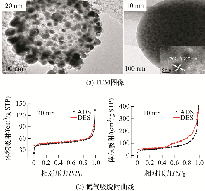 在锂/钠离子电池中设计纳米化的负极材料能够有效增加合金颗粒的比表面积、缩短Li+/Na+的扩散距离、使活性材料能够充分参与反应,同时也能够在一定程度上缓解再循环过程中体积变化带来的负面影响,提高电极的循环稳定性。YUE等[34]以不同粒径的纳米锑掺杂二氧化锡(小于10 nm,20~40 nm,小于100 nm)粉末为前驱体,通过高温煅烧制备得到分散均匀的SnSb合金颗粒/石墨烯复合材料(图1a),发现锡锑合金颗粒的尺寸分布在3~6 nm时,具有最高的比表面积(图1b),图中高度分散的纳米SnSb合金具有良好的应力适应性和良好的完整性,还提供了快速的Na+扩散和电子传输通道。此外,在电化学阻抗谱中,尺寸小于10 nm的SnSb合金颗粒复合材料表现出最低的电荷转移电阻 (图1c)。用作钠离子电池负极材料时,在600 mA/g电流密度下循环300次仍保持320 mA·h/g的可逆容量。LI等[35]通过一种简单的化学还原法,利用NaBH4将SnCl4·5H2O和SbCl3还原成SnSb纳米颗粒并嵌入纳米多孔碳骨架中(SnSb@NPC),其中,SnSb纳米颗粒的尺寸仅为2 nm(图2a),这种超小的SnSb纳米颗粒均匀分布在三维多孔碳材料中,增大了电极材料的比表面积,从而保证了活性材料的充分利用,同时也缩短了钠离子的扩散路径,最终在0.2 A/g电流密度下,经100次循环后仍有693.6 mA·h/g的可逆容量(图2b)。李海霞等[41]通过调节前驱液的锡离子和锑离子浓度,利用喷雾热解技术制备了不同粒径(10 nm,20 nm)的SnSb合金颗粒。BET测试发现,SnSb合金颗粒尺寸为10 nm时,活性材料表现出更高的比表面积(图3),超小的SnSb纳米颗粒(10 nm)可以显著减小活性物质在脱嵌锂/钠过程中产生的形变应力,提高其反应利用率,并能有效缓冲SnSb纳米颗粒在循环过程中的体积变化,从而有效抑制粉化与团聚。当用作钠离子电池负极材料时,经200次循环容量达到623 mA·h/g,容量保持率达95%。