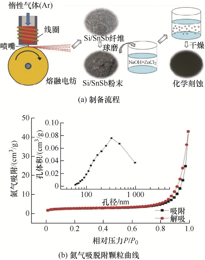 纳米化SnSb合金颗粒的高表面积导致的高表面活性,使得SnSb合金在循环过程中逐渐团聚和生长,造成电极的循环性能变差。此外,由于SnSb合金负极材料在循环过程中体积变化较大,需要不断消耗电解液形成新的SEI膜,造成不可逆容量的损失。为了进一步提高负极材料的结构和循环稳定性,在纳米化的基础上,有研究人员直接对SnSb合金进行了多孔化结构设计[42-43]。MA等[27]以Mg90Sn5Sb5为前驱体,利用酒石酸溶液(2 wt%)进行化学脱合金制备得到了纳米多孔SnSb合金(图4a)结构,该结构具有纳米级相互连接的多孔(图4b),将其作为钠离子电池负极材料,具有优异的循环稳定性和倍率性能(图4c)。在0.2 A/g到10 A/g的电流密度下,钠离子电池的可逆容量仍然高达458.2 mA·h/g。CHOI等[43]通过熔融纺丝和化学蚀刻的方法(图5a),制备得到多孔无碳的SnSb合金纳米颗粒。BET测试发现,多孔SnSb合金纳米颗粒的比表面积高达12 m2/g(图5b),将其作为钠离子电池负极材料时,表现出高可逆容量和高容量保持率特性。YI等[42]以纳米锡粉为模板和还原剂(图6a),通过置换反应制备SnSb合金也具有多孔的结构(图6b),在该结构中,中空的球形结构可以缩短离子的传输距离,并提供额外的自由空间来缓冲嵌脱锂/钠离子时的体积膨胀。作为锂离子电池的负极材料,在100 mA·h/g电流密度下,经100次循环容量达到751 mA·h/g。