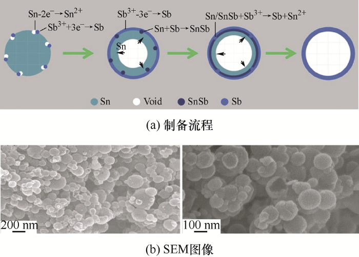 为此,很多研究人员将目光转向锡锑(SnSb)双金属合金材料,其中Sn和Sb的氧化还原电位不同,可以极大地减缓在充放电过程中材料内部的应力。在锂/钠离子电池中,由于Li3Sb/Na3Sb形成的电位较高,锂/钠离子将先会和Sb进行结合(SnSb+3Li→Li3Sb+Sn,SnSb+3Na→Na3Sb+Sn),此时,Sn将提供稳定的结构,缓解嵌入时的体积膨胀;随后,锂/钠离子将会在更低的电位与Sn结合(Sn+4.4Li→Li4.4Sn,4Sn+15Na→Na15Sn4),这种分步反应会极大程度减少电极材料粉化,同时通过这种合金机制反应,SnSb合金负极材料可以在锂/钠离子中提供很高的理论容量[27-28]。然而,在实际材料合成和应用中仍存在着诸多问题,如锡盐和锑盐在水溶液中极易水解,导致锡、锑纳米颗粒分散不均;锡锑合金具有较高表面能,在合成过程中很容易结块;在循环过程中,仍存在较大的体积变化等。