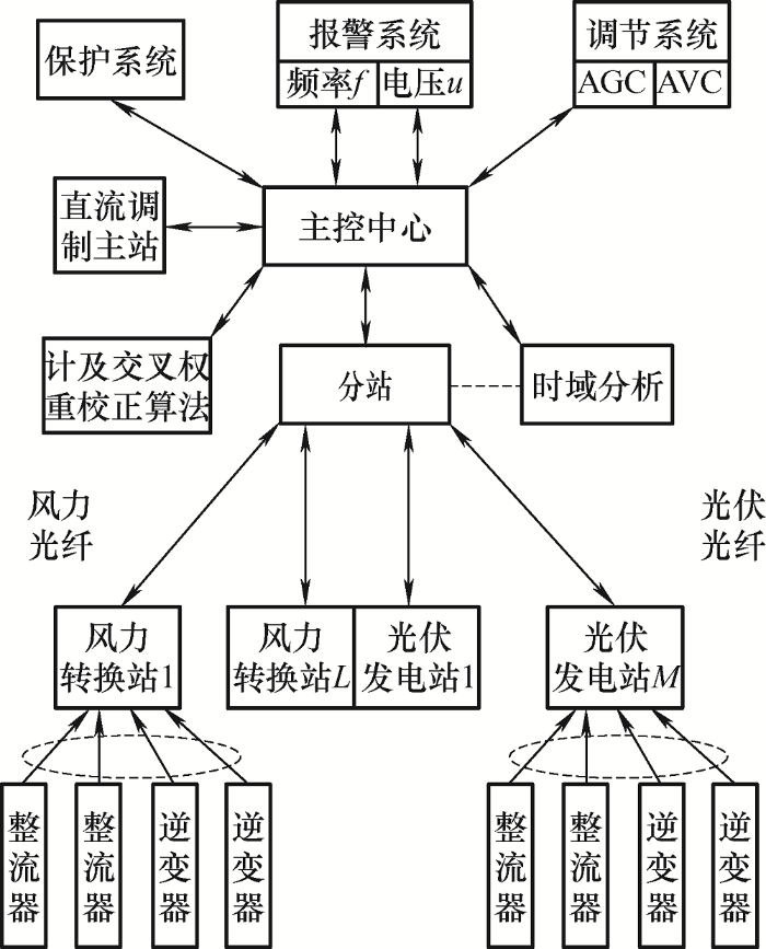 主控中心通过计及交叉权重校正算法和时域分析完成电力数据的有功校正和系统稳定分析,从而方便各个分站电能的分配,最终由整流器和逆变器进行信号转换和传输[6 ] 。