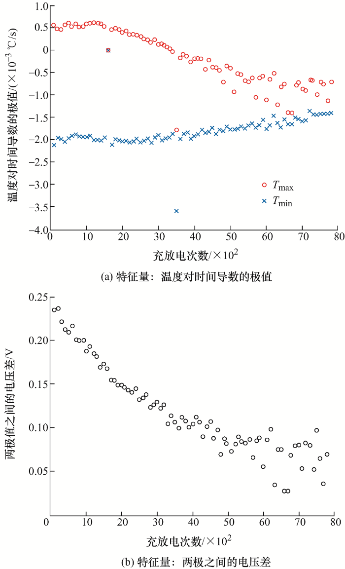 因此,本文分别以极大值Tmax、极小值Tmin和两极值之间的电压差dV为特征量,分析其与SOH之间的相关性,如图2所示,横坐标为充放电次数(单位:百次),纵坐标分别为三个特征量。