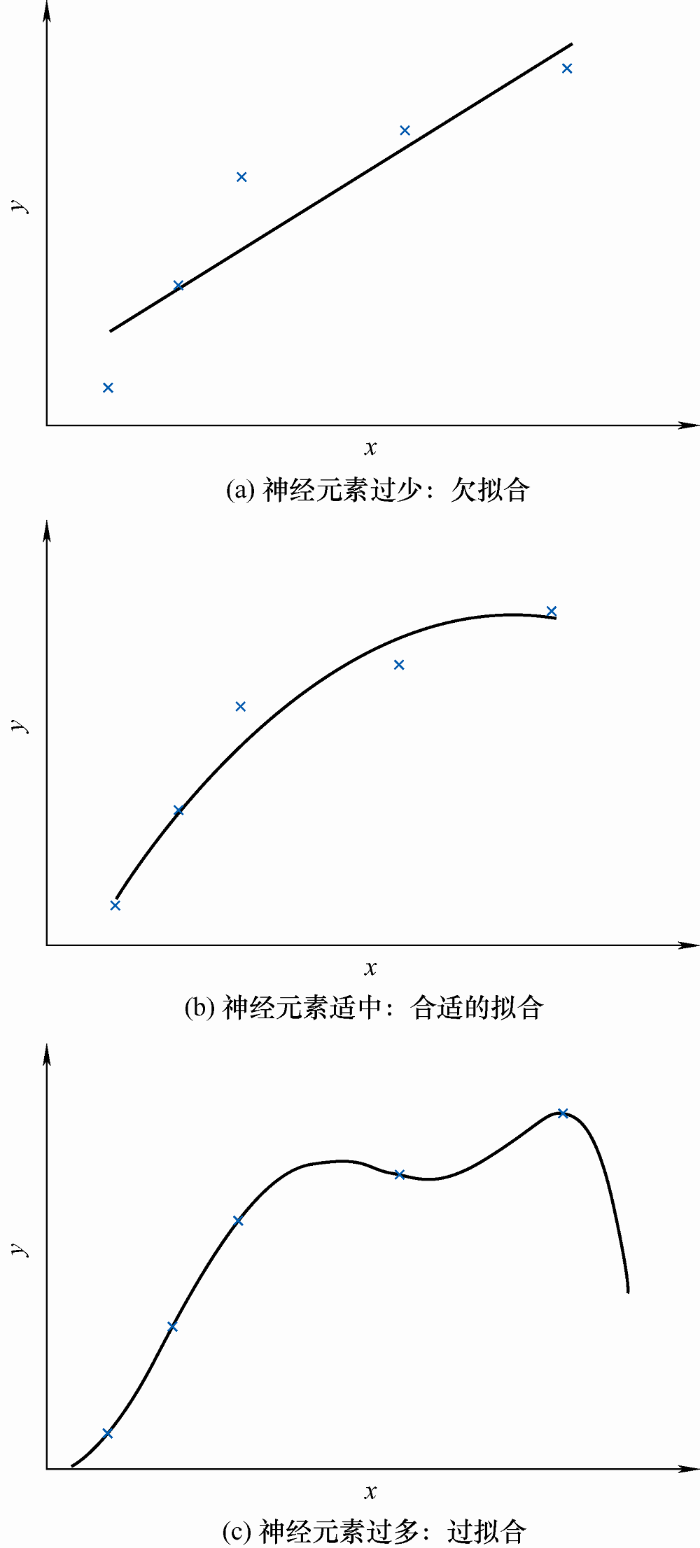 在隐藏层中使用太少的神经元将导致欠拟合,相反,使用过多的神经元会导致过拟合。两者都难以达到合适的训练效果,如图4所示。
