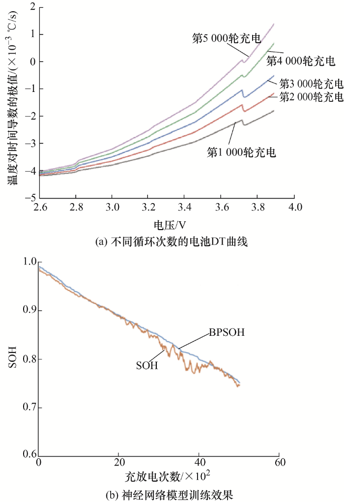 (1) 首先通过对电压与电池温度变化率的关联曲线进行SOH特征值提取,选取了极大值、极小值和两极值之间的电压差为特征量,作为分析其与SOH之间相关性的依据。