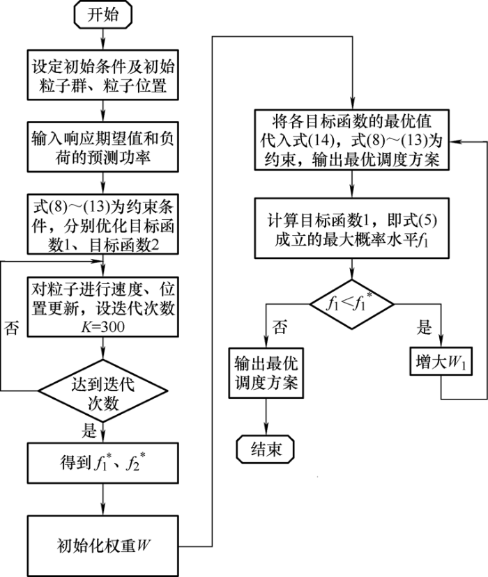利用粒子群优化算法得到目标函数1、目标函数2的最优解$f_{1}^{*}$ 、$f_{2}^{*}$ ,再代入式(14)中,求出最优的权重系数W 1 ,并输出最优的调度方案。图2 为模型求解流程。