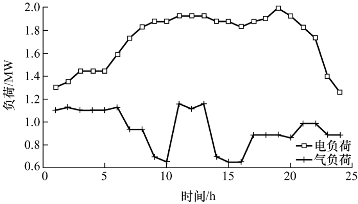 图3 所示的电负荷为居民用电负荷,气负荷为燃气轮机的出力用气。该区域白天用电多,夜间用电少,系统的电负荷需求存在明显峰谷现象。为了提升综合运营商经济效益,缓解高峰时段供电紧张的局面,在该社区综合能源系统调度中引入电- 气联合需求响应,实现两种能源互补运行,从而提高能源综合利用效率。
