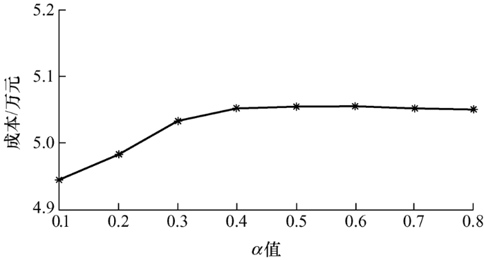 模型3通过相关机会规划方法求解,引入可接受的最小误差α ,即可接受的功率不平衡量,相比于机会约束方法,可以减小系统两端电能的供需偏差,在保证系统稳定运行的同时,降低经济成本。图6 表明随着可接受的功率不平衡量α 的增大,模型3的运行成本随着机会函数成立的概率增大而增大。图6 中当α 在[0.1,0.4]区间取值时,成本会随着α 取值的增加而增大;当α 取值大于0.4时,成本趋于稳定。可以得出α 在0.4左右水平时,机会函数成立的概率接近1。因此,α 在[0.4,0.8]区间随着取值的增大,成本将不再增加。综上,系统运行总成本和机会函数成立的概率水平与功率不平衡量α 有关,因此,调度员可根据实际情况选择合适的功率不平衡量,在风险和利益之间进行权衡,获得最大收益。